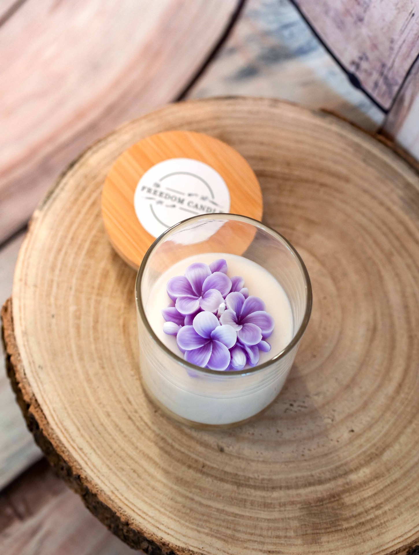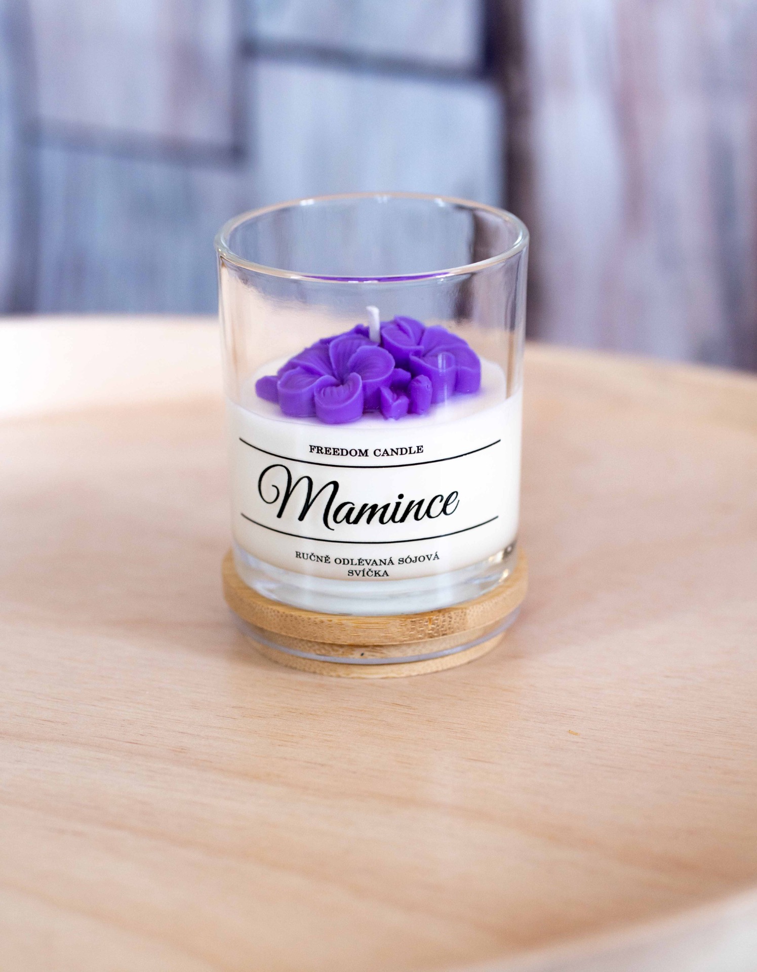 Svíčka odlévaná z přírodních vosků v čirém skle, zdobená odlévanými fialovými květy. Svíčka má příjemnou vůní fialek, která do vašeho domova vnese jarní náladu. Pro uchováni vůně a čistoty vaší svíčky, je doplněna o bambusové víčko. Uzavíráním zamezíte usazování prachu na vosku a až vám svíčka vyhoří můžete sklenici využít dál. Při správné péči vydrží hořet až 30 hodin.