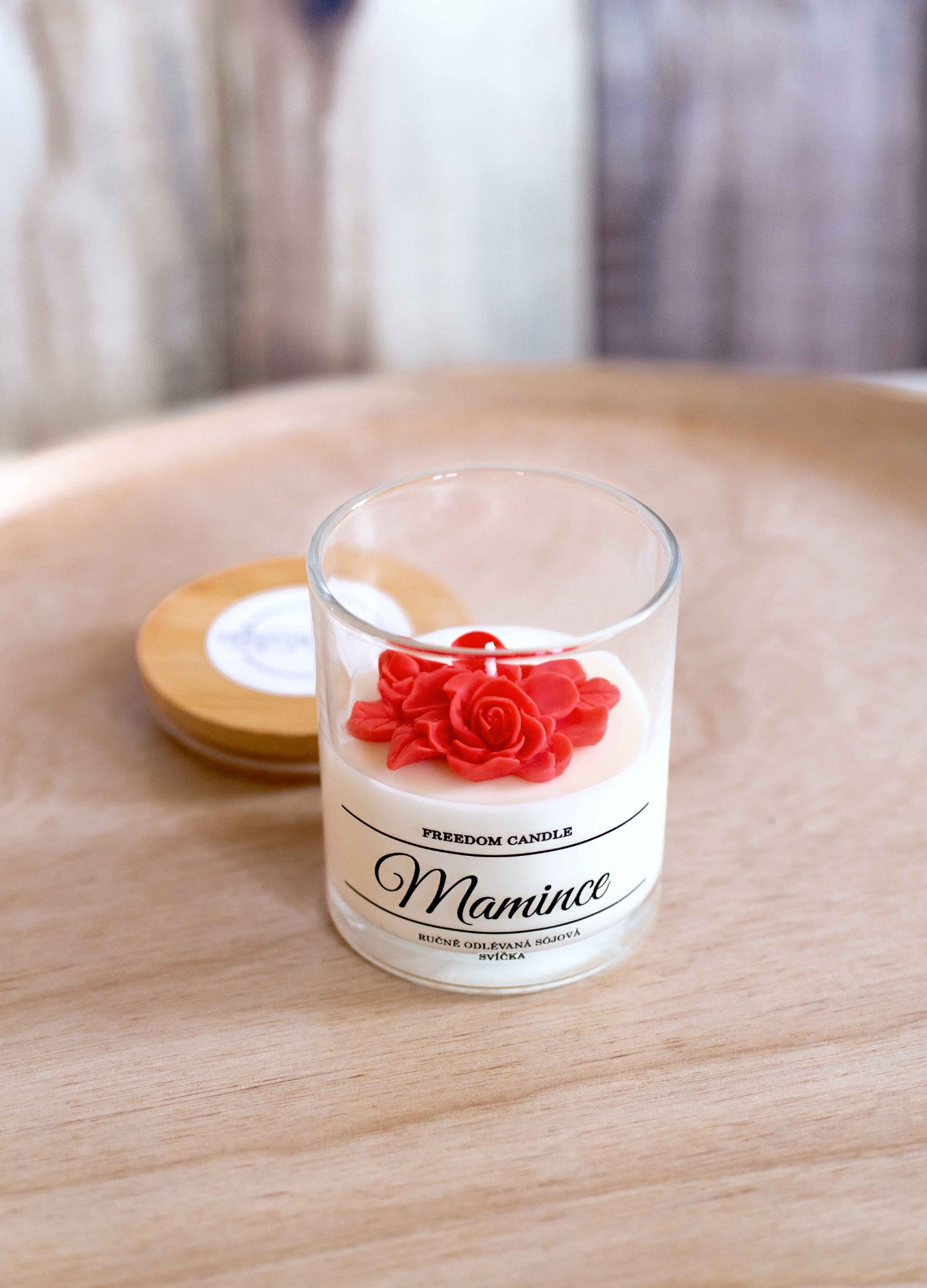 Svíčka odlévaná z přírodních vosků v čirém skle, zdobená odlévanými červenými květy. Svíčka má příjemnou vůní švestek a růži, která do vašeho domova vnese sladkou vůni šťavnatých švestek a jemné květinové vůně růže. Pro uchováni vůně a čistoty vaší svíčky, je doplněna o bambusové víčko. Uzavíráním zamezíte usazování prachu na vosku a až vám svíčka vyhoří můžete sklenici využít dál. Při správné péči vydrží hořet až 30 hodin.