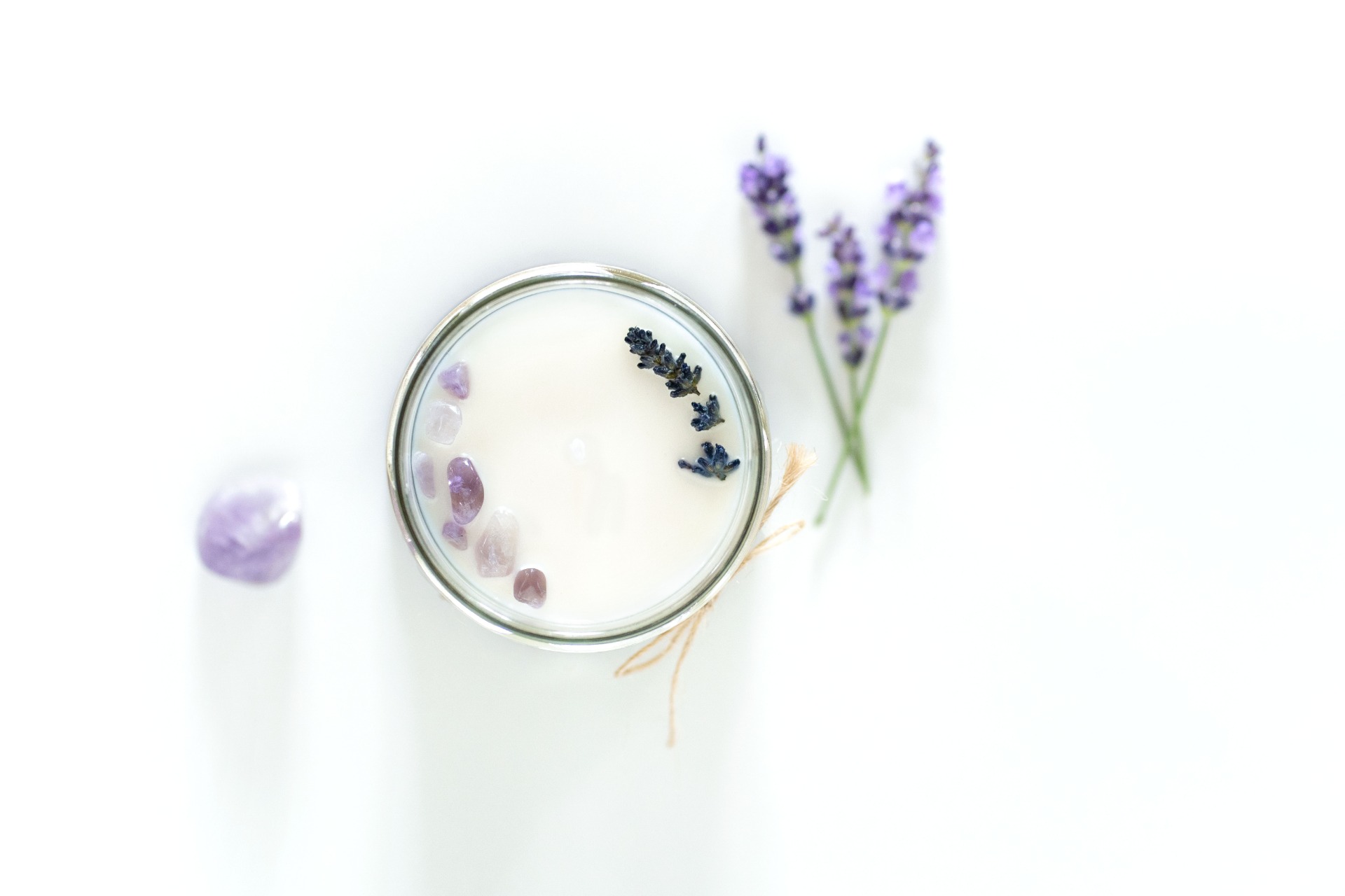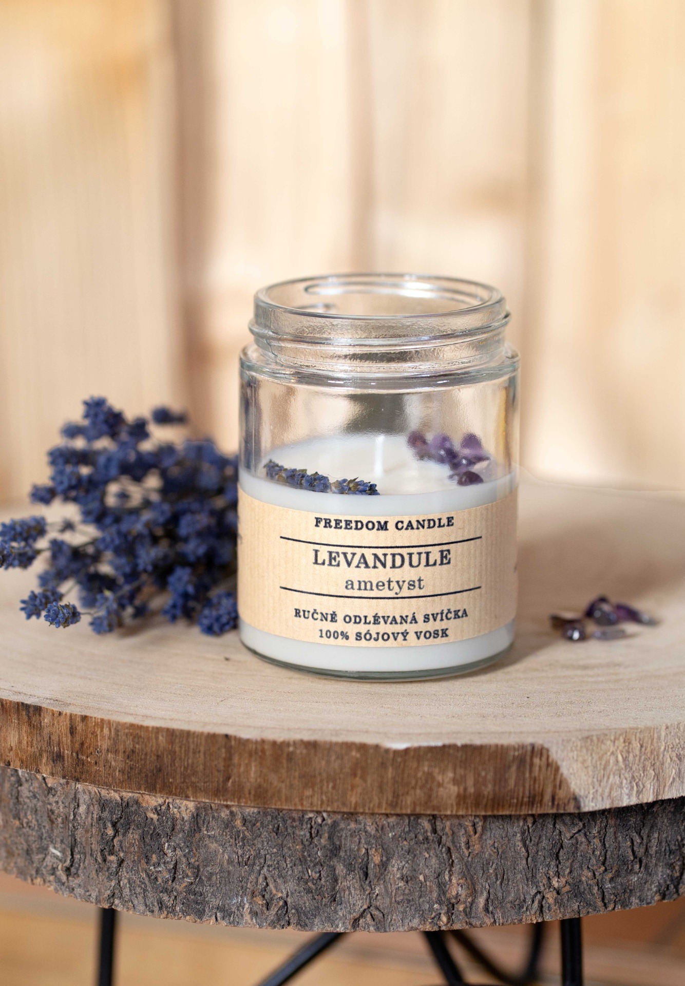 Sójová svíčka ve skle s minerálními kameny a sušenými bylinkami z vlastní zahrádky. Příjemná vůně levandule, která neobtěžuje a jen kolem vás jemně plyne doplněná o kamínky ametystu. Levandule uklidňuje při napětí a depresi, tlumí bolesti hlavy, Ametyst je kamenem duchovní čistoty s velikou ochrannou silou. Zahání negativní emoce, stres, nespavost a noční můry.