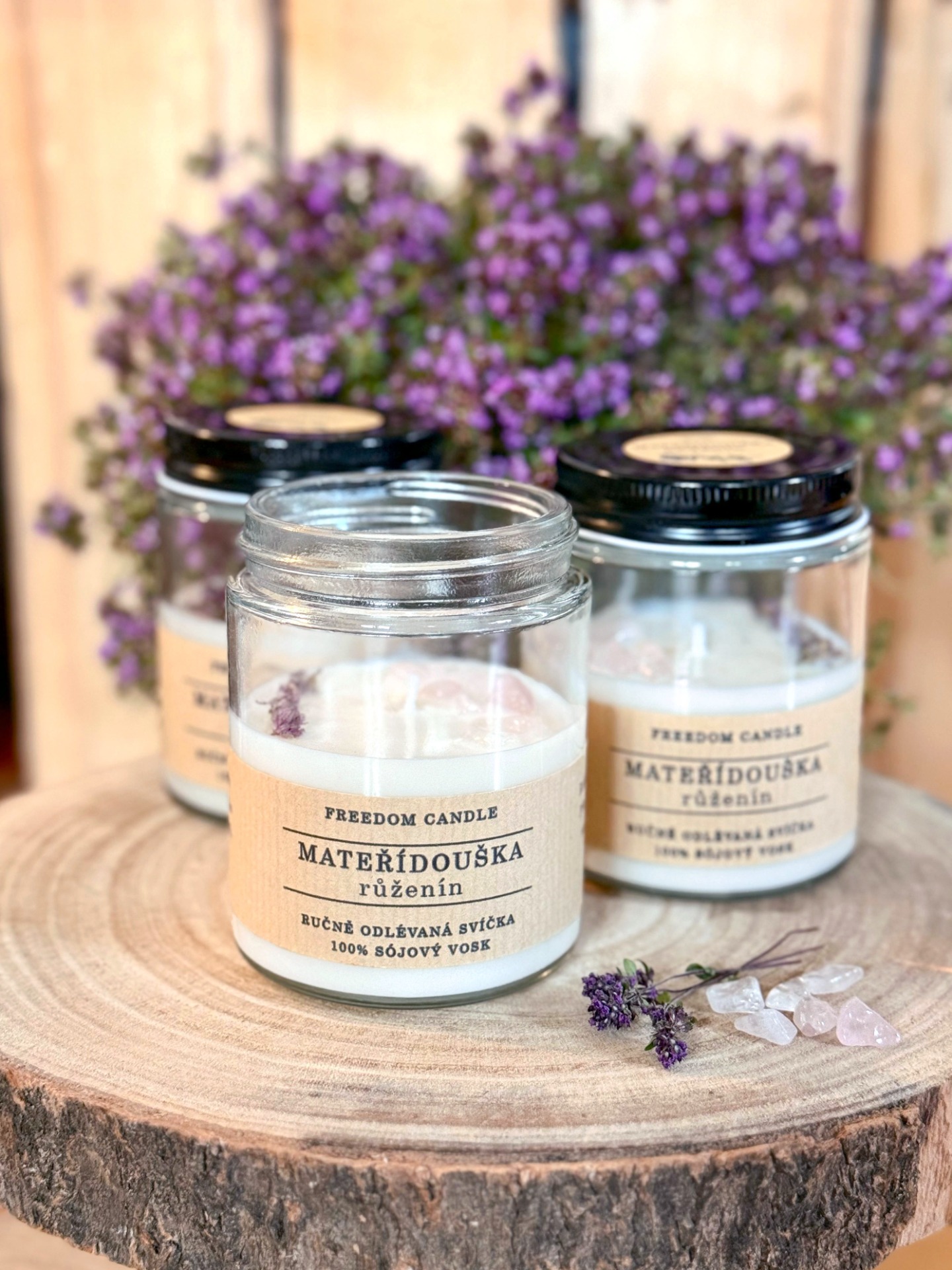 Sójová svíčka ve skle s minerálními kameny a sušenými bylinkami z vlastní zahrádky. Příjemná vůně mateřídoušky, která neobtěžuje a jen kolem vás jemně plyne doplněná o minerální kamínky růženínu. Mateřídouška pomáhá uklidnit nervový systém a snížit úzkost a napětí. Růženín otevírá srdce a smysly všem krásným věcem, které nás obklopují.
