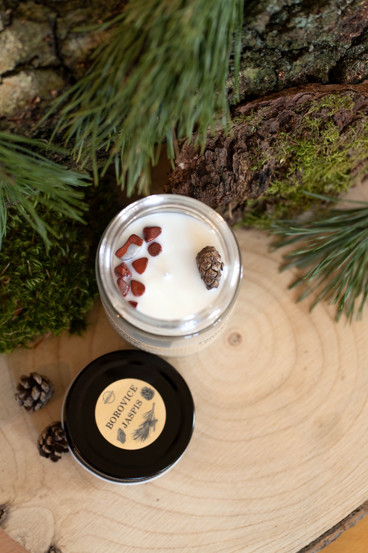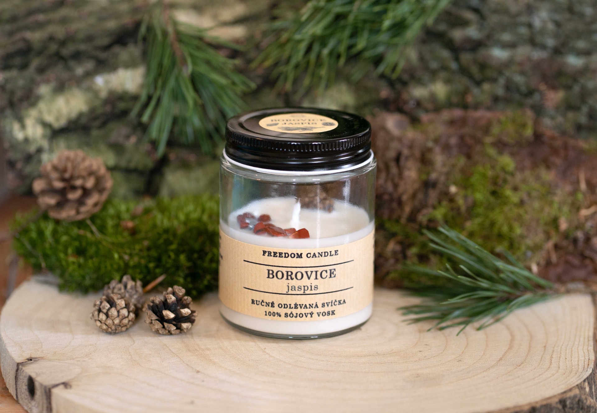 Sójová svíčka ve skle s minerálními kameny. Příjemná vůně borového lesa, která neobtěžuje a jen kolem vás jemně plyne doplněná o minerální kamínky jaspisu. Zapalte si svíčku a nechte se vnést do vůně lesa. Svíčka je doplněná o minerální kameny jaspisu, které jsou k nalezení i v našem kraji v oblasti Kozákova. Jaspis podporuje kreativitu a soulad se zákony přírody. Obecně platí, že jaspis sjednocuje, sytí a živí dobrou energií.