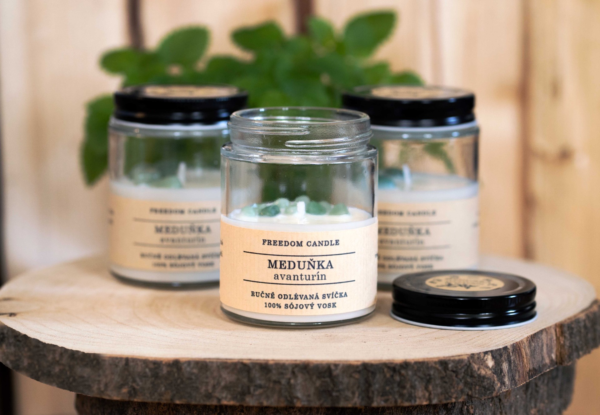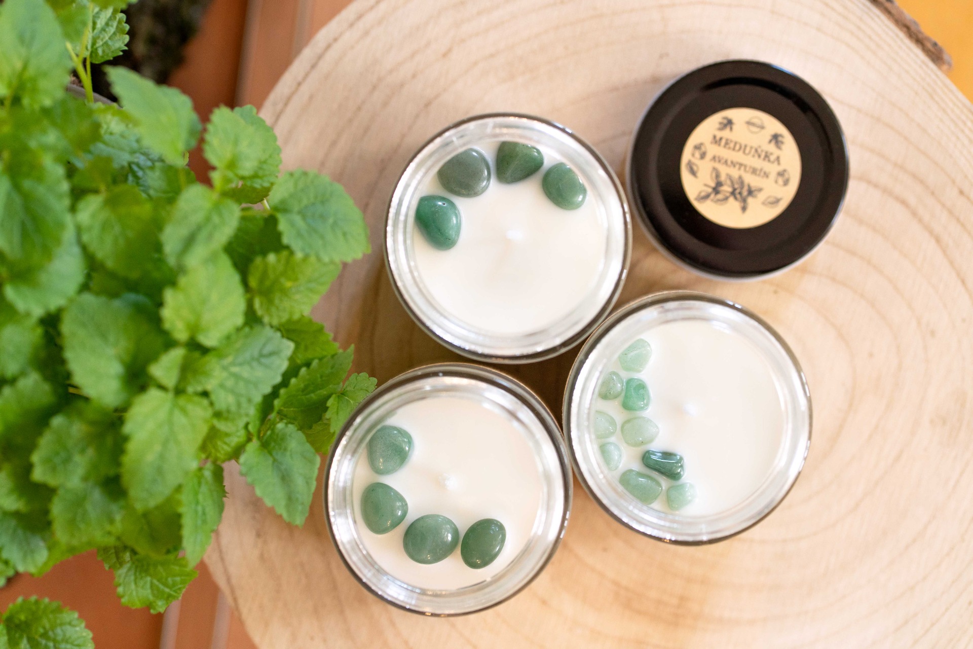 Sójová svíčka ve skle s minerálními kameny. Příjemná vůně meduňky, která neobtěžuje a jen kolem vás jemně plyne doplněná o minerální kamínky avanturínu. Bylinkově - citrusová vůně meduňky uvolňuje napětí a nervozitu. Avanturín rozpouští všechny chmury a negativní myšlenky a s nimi spojené pocity.